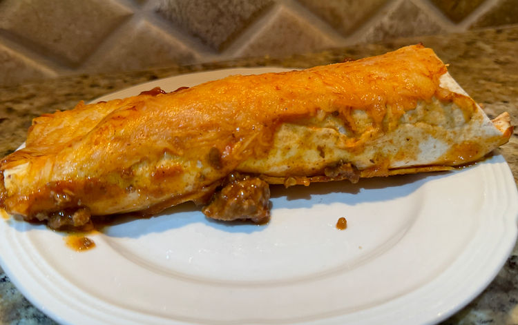 Lay tortilla on a flat surface and spoon ground beef mixture down the middle, top with about 1/8 cup of cheese. Roll up tortilla, tucking in one side and leaving one side open. Place, seam side down, in the baking dish. Repeat with remaining tortillas.